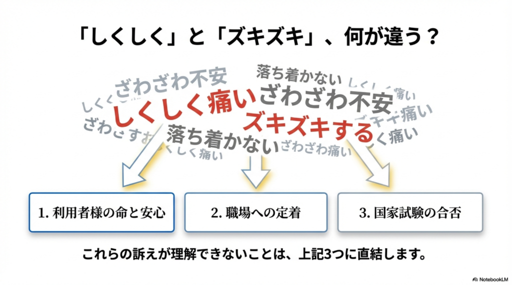 「ズキズキ」「ザワザワ」をどう理解するか、どう受け止めるかは、扱ってこなかった。